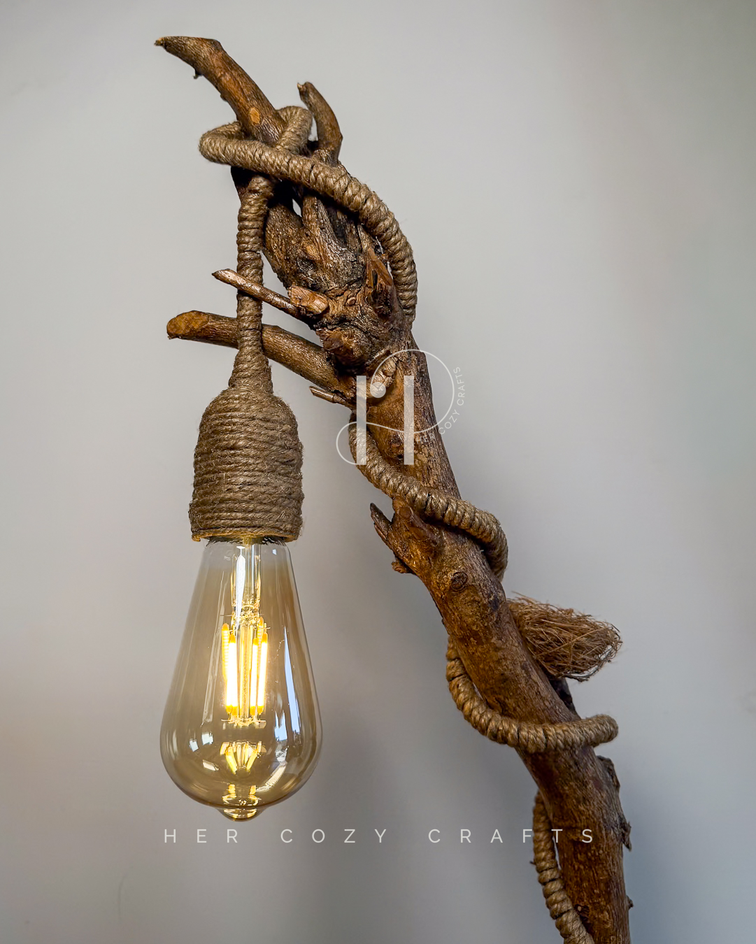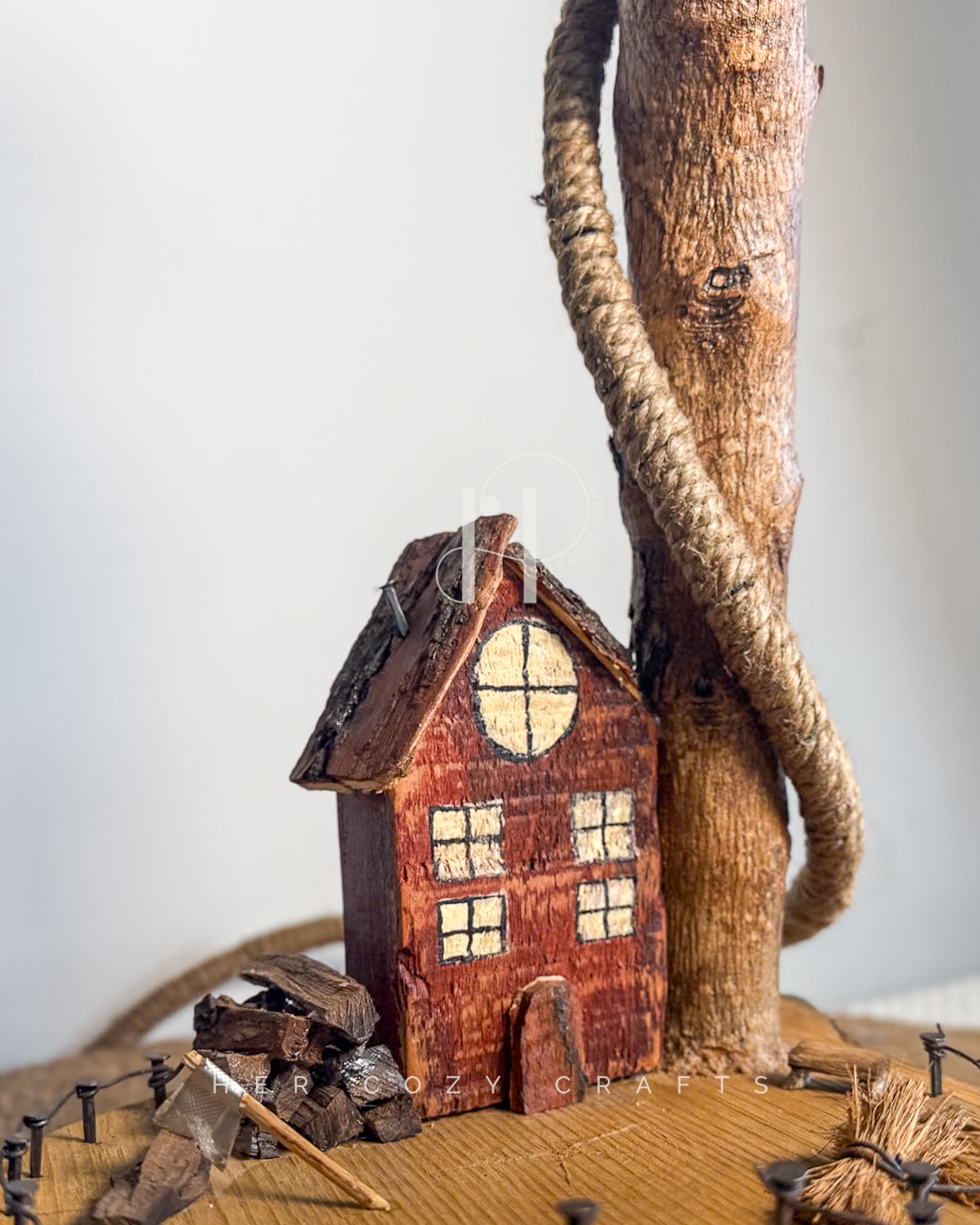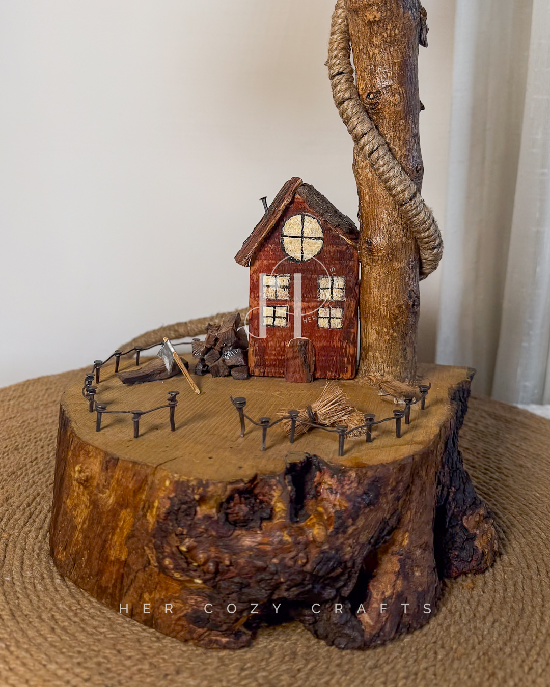 This lamp is built around a tall, lofted branch that rises from a natural wood base and curves slightly at the top, giving it a graceful look. At the bottom sits a tiny hand built cottage with a fenced yard, tools and stacked wood that make the scene feel lived in. The base is made from real tree wood so the bark, grain and edges stay natural. It is a good piece for consoles, side tables or a reading corner where you want height without taking too much space on the surface. Light, texture and story in one piece.