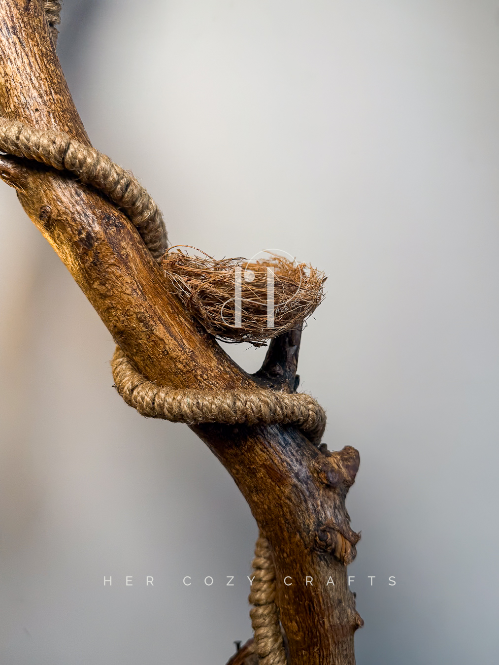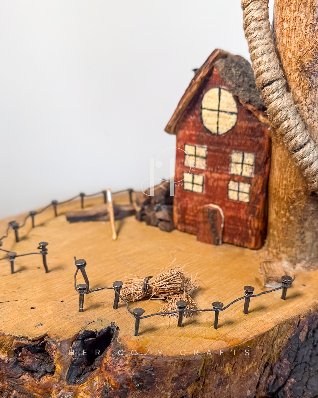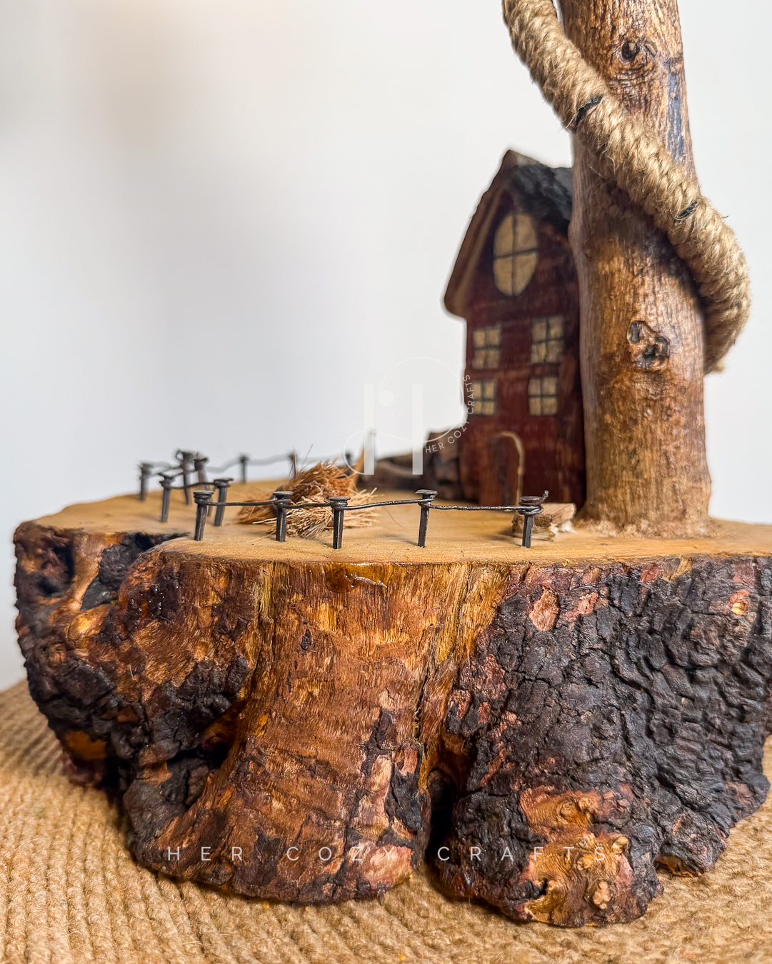 This lamp is built around a tall, lofted branch that rises from a natural wood base and curves slightly at the top, giving it a graceful look. At the bottom sits a tiny hand built cottage with a fenced yard, tools and stacked wood that make the scene feel lived in. The base is made from real tree wood so the bark, grain and edges stay natural. It is a good piece for consoles, side tables or a reading corner where you want height without taking too much space on the surface. Light, texture and story in one piece.