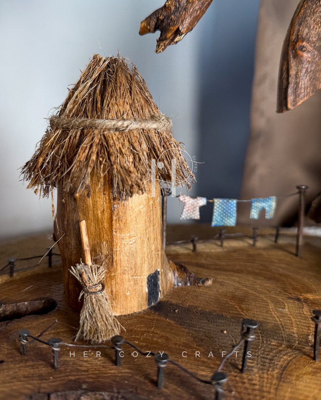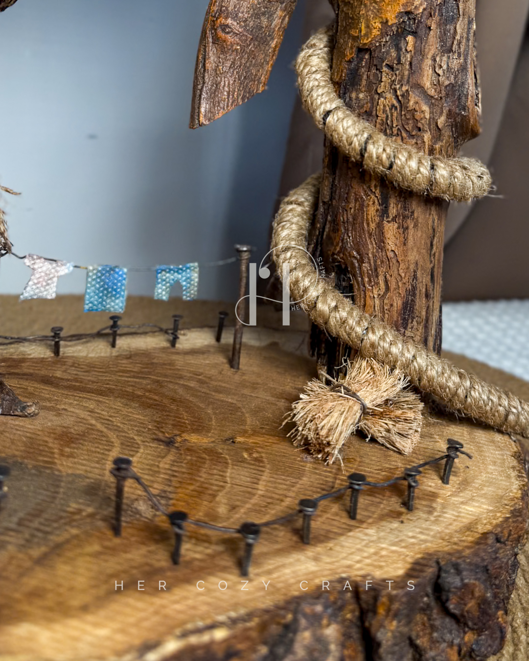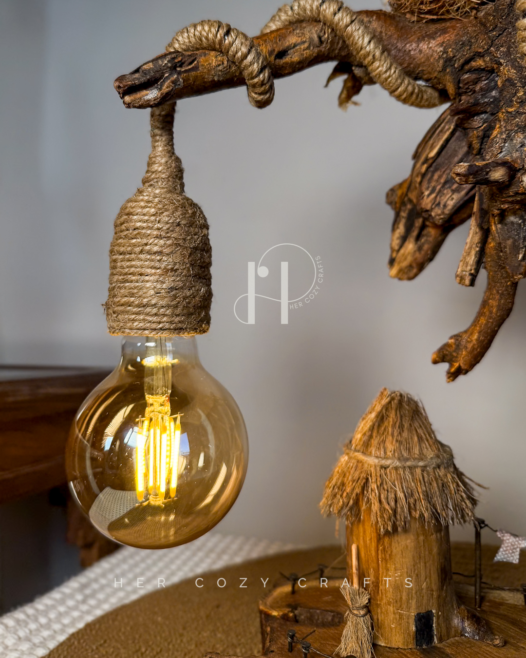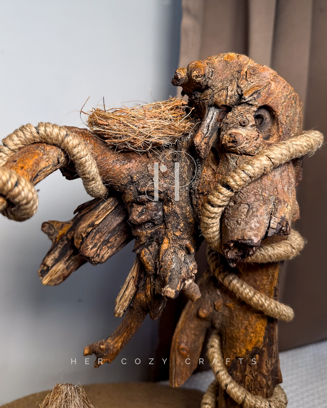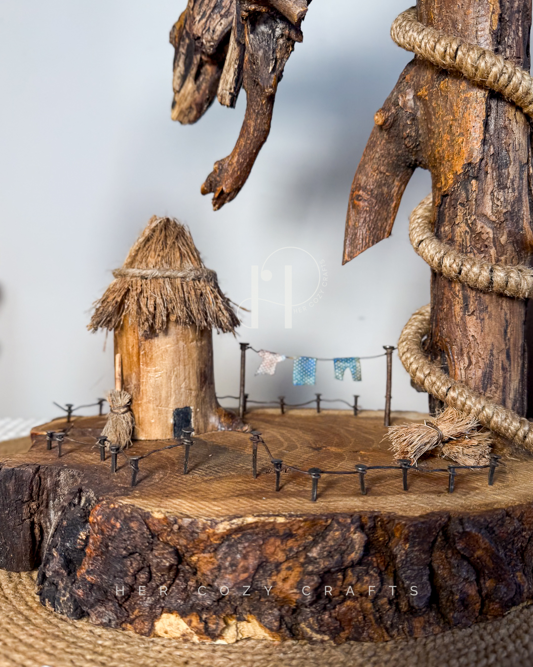 Wild Crest Lamp is made from a forward leaning wood form that feels like it is watching over the scene below. The top bends out, creating space for the light to hang, while the base is kept low for a tiny yard setup. The vertical cut marks, natural knots, and split bark are all left visible so the lamp keeps its raw forest look. Style it on a console, study table, or entry corner where you want something handmade, sculptural, and warm. Custom miniatures on the base can be added to match your setup.